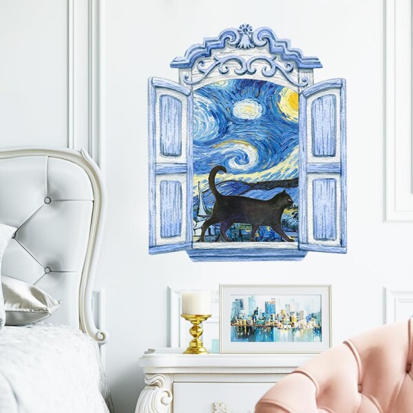 Mestiker 偽窓ステッカー ポスター 窓の景色 ゴッホの星空 壁紙シール はがせる おしゃれ 北欧 ウォールシール ?K猫 おしゃれ 猫 ウォールステッカー 絵画? インテリア おしゃれ 37*44.5CM