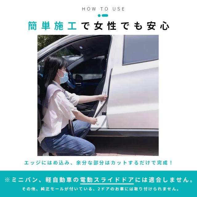 前ドアを開け、後部座席側のドアの前面側に挟み込んで、余分な部分はカットしてください。