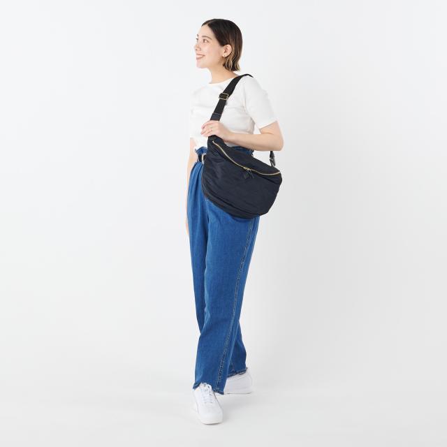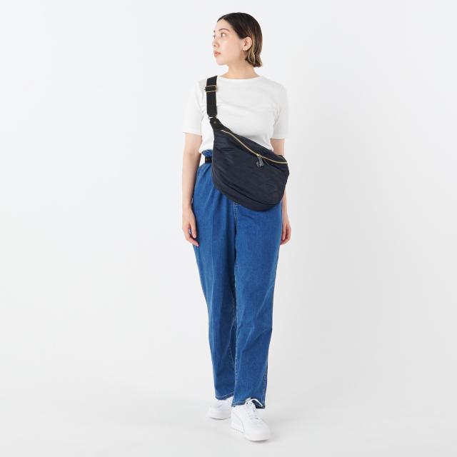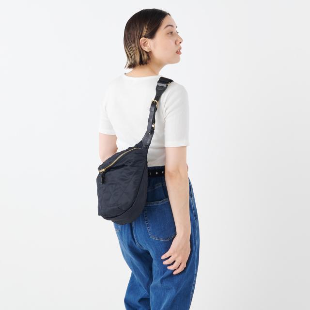 ツルリとしたなめらかな手触りのキルティングナイロンが魅力のボディバッグ。シンプルなデザインで、男女問わずお使いいただけます。優しく身体に沿って持ちやすい三日月型フォルム。薄マチながら、お出かけに必要な携行品をしっかり収納できるサイズです。雨や汚れに強い安心軽量素材のナイロンを使用。アクティブに連れ出したいボディバッグだからこそ、嬉しいポイントです。気軽に連れ出せる雰囲気がありながら、上品な光沢を放つナイロンと艶やかなレザーの組み合わせで、大人のアイテムに仕上がりました。
