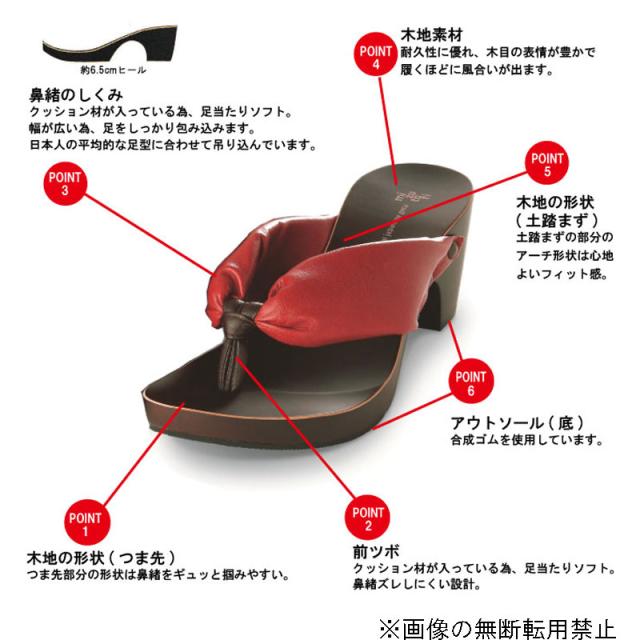 足裏にフィットするように施されたオリジナルの彫りと、クッション性のある鼻緒による履き心地の良さを実現した、浴衣や着物はもちろんお洋服にも似合うシンプルなデザイン。日本の伝統的なカタチがモダンな雰囲気を演出。