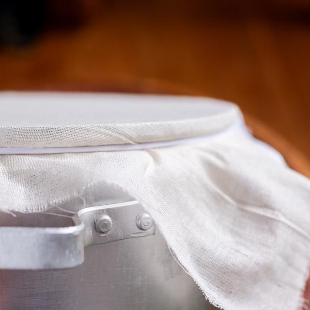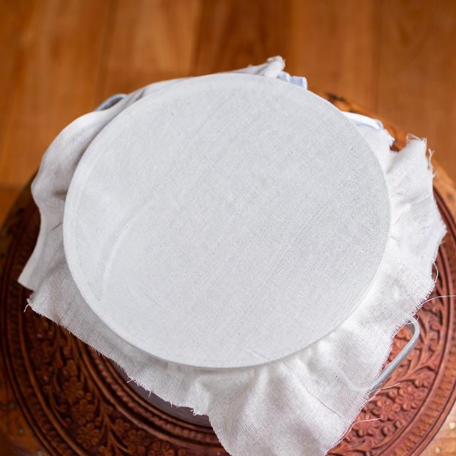 一見するとシンプルなアルミ製の両手鍋ですが、実はベトナムでは「バイン・チャン(ライスペーパー)」を蒸すためのスチーマーとして昔から使われてきたお鍋です。鍋の上に布を張り、縁に紐を巻いてピンと張った状態にした上で、その布の上に米粉のペーストを広げて蒸し上げることで、薄くてしなやかなライスペーパーを作ることができます。縁の部分が凹んでいるので、布を紐で固定しやすいようになっています。また、鍋上部にリング状になっているパーツが嵌め込まれていますが、そちらに布を固定することもできます。現地では、布が袋状になっている物も売られているようで、そちらを使ったりもしているようです。恐れ入りますが、布と紐は付属ございませので、別途ご用意いただけますと幸いです。