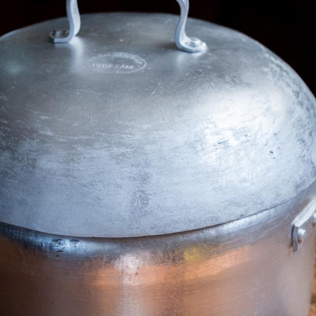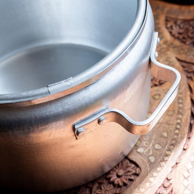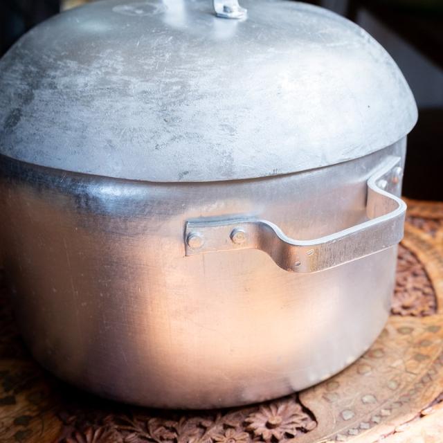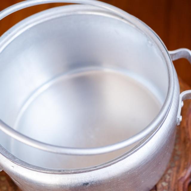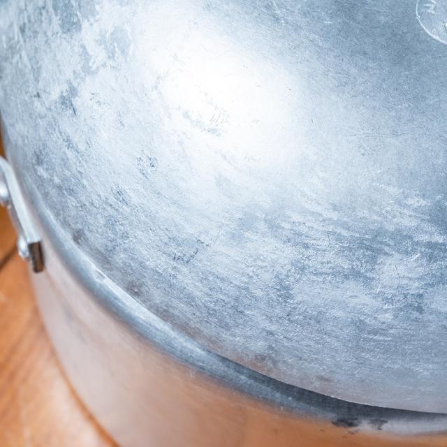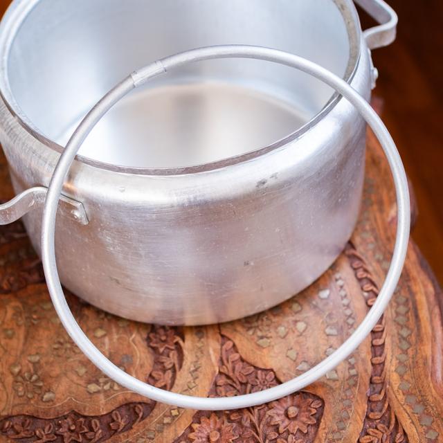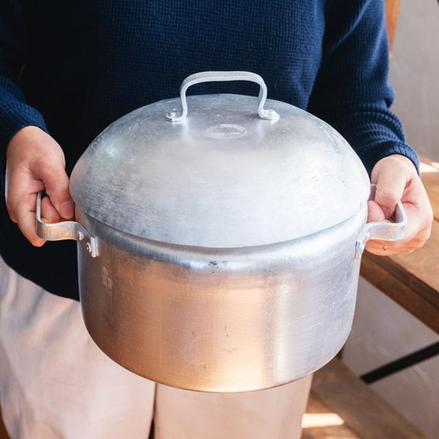 装飾を排したすっきりとした佇まいに、どこか懐かしさを感じるレトロなフォルム。表面には塗装やコーティングを施さない無垢なアルミの素材感がそのまま現れており、光の加減でマットな艶が浮かび上がります。うっすらと残る研磨の跡や、わずかな曇り、ムラもまた味わい。道具としての実用性とともに、ヴィンテージ感ある雰囲気を楽しめます。■約6Lの大容量。普段使いの鍋としても