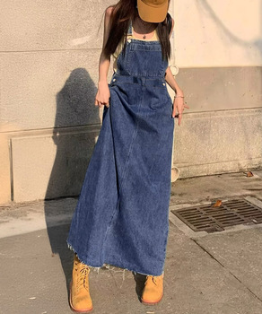マキシ丈ジャンパースカート デニムサスペンダーワンピーススリット 着やせロングスカート レイヤードデニムワンピース風体型カバーゆったり オールインワン四季 デニムサスペンダー