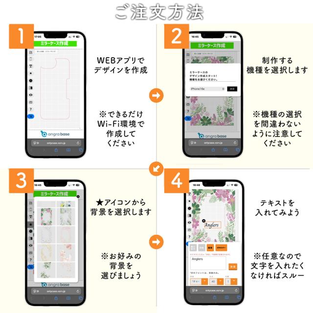 | 商品説明 | このミラーケースの魅力はデザインの自由度!無料のWEBアプリを使えば、あなたの好きな文字やイラストを、筆記体を含む豊富なフォントやiPhoneの絵文字を使って、誰でも簡単におよそ2〜3分でデザインできます。推しの名前や好きな言葉、大切なメッセージなどを入れて、世界に一つだけのオリジナルケースを作れます。 |