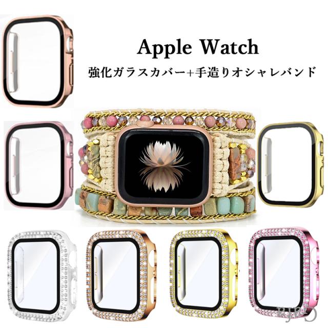 アップルウォッチカバーバンドセット Apple watchカバーバンド ダブルラインストーン強化ガラスカバー AppleWatch交換ベルト デコ 女性 レディースApple Watch 40mm 41mm 42mm 44mm 45mm 46mm 49mm アップルウォッチバンド ブレスレット 人造 真珠 パール 手作り