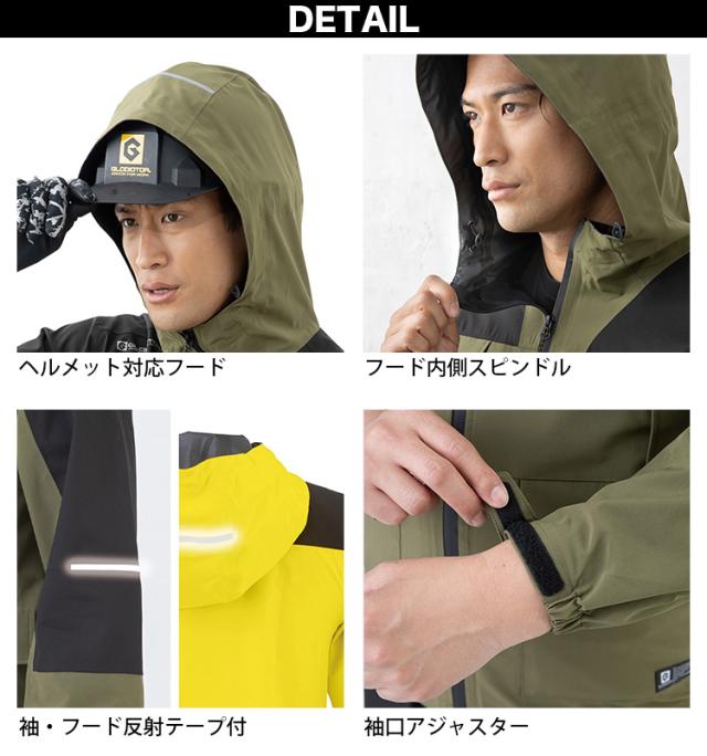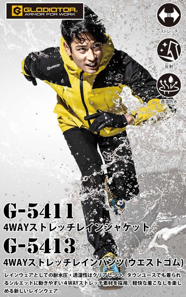 GLADIATOR コーコス 4WAYストレッチレインジャケット レインパンツ ウエストゴム G-5411 G-5413 上下セット 現場 合羽 レインウェア ヘルメット対応フード付き 反射テープ 透湿防水
