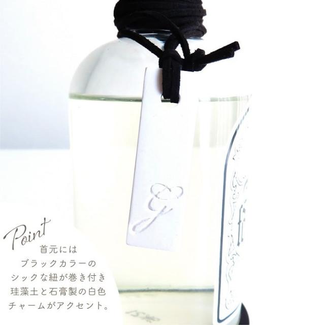 重厚感のあるガラスボトル、スティックを挿すことで存在感のあるインテリアになる交換用リフィルボトル。オイルボトルには黒色の紐とアロマストーンになるチャーム、専用コースターが附属した付加価値の高い贅沢な仕様です。