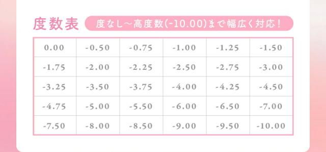 | ◆度数◆ | ±0.00、-0.50〜-5.00(0.25ステップ)-5.50〜-10.00(0.50ステップ) |