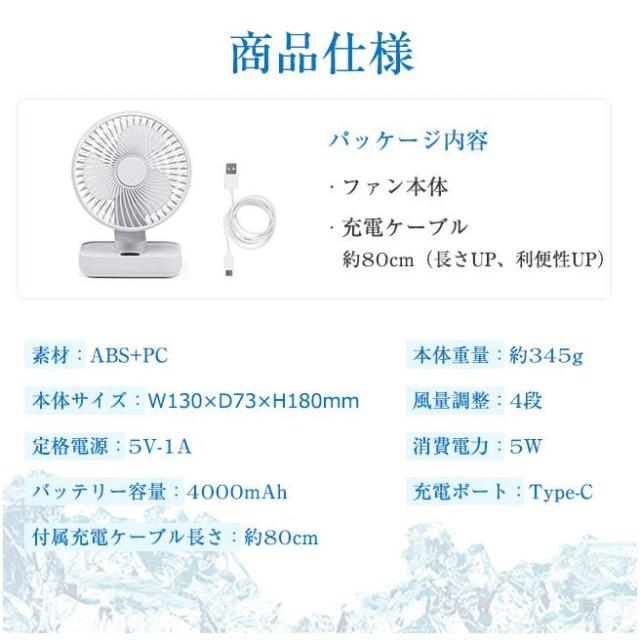 パッケージ内容:ファン本体、充電ケーブル、取扱説明書