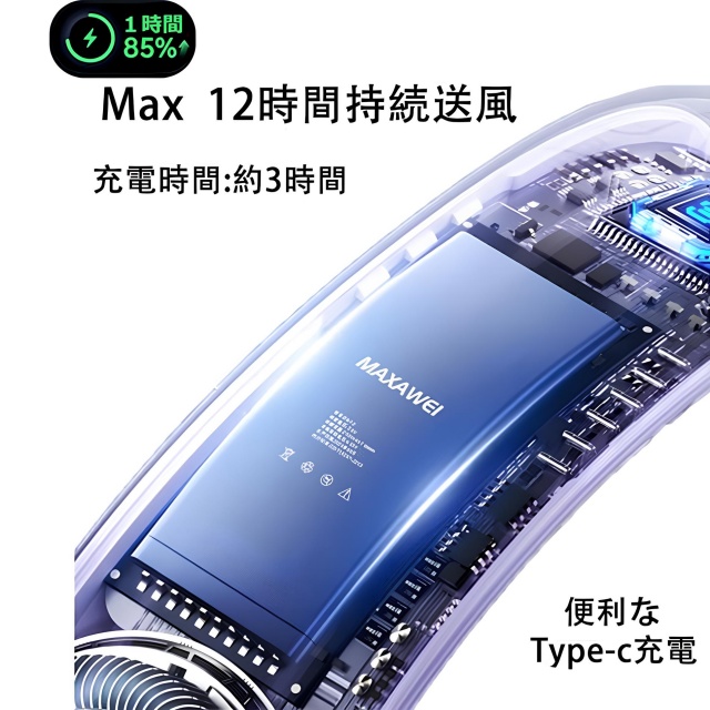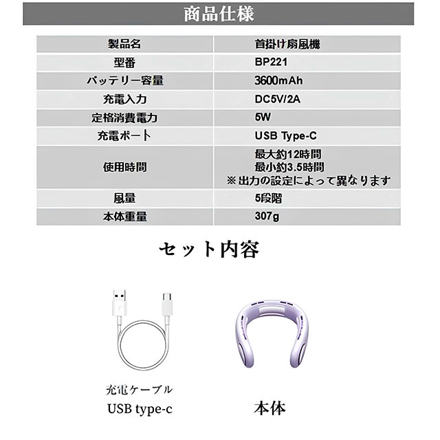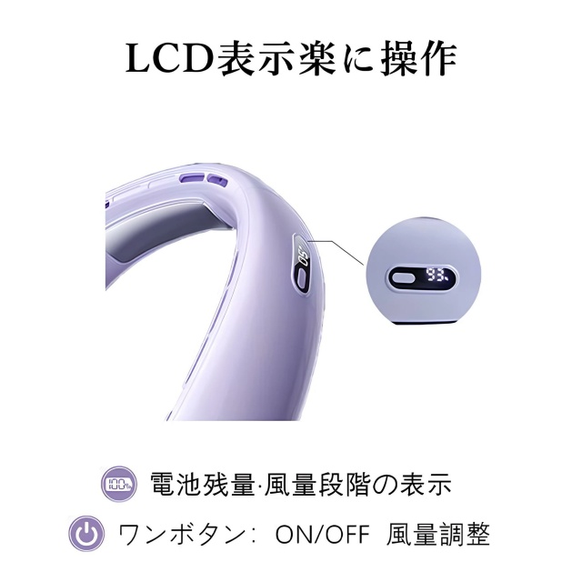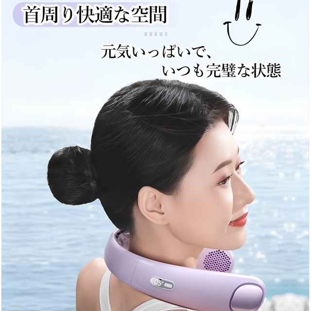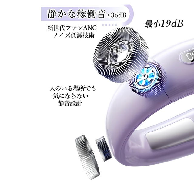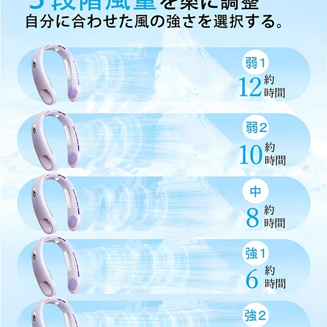 5段自由に調節できるの くびかけ扇風機 は、様々なシーンを満たす,風向も自分に最快適の角度に調節可能。 運転音は20dBと静音設計になっているので通勤・通学のバスや電車の中、オフィスなどでも騒音を気にせずお使いいただける。