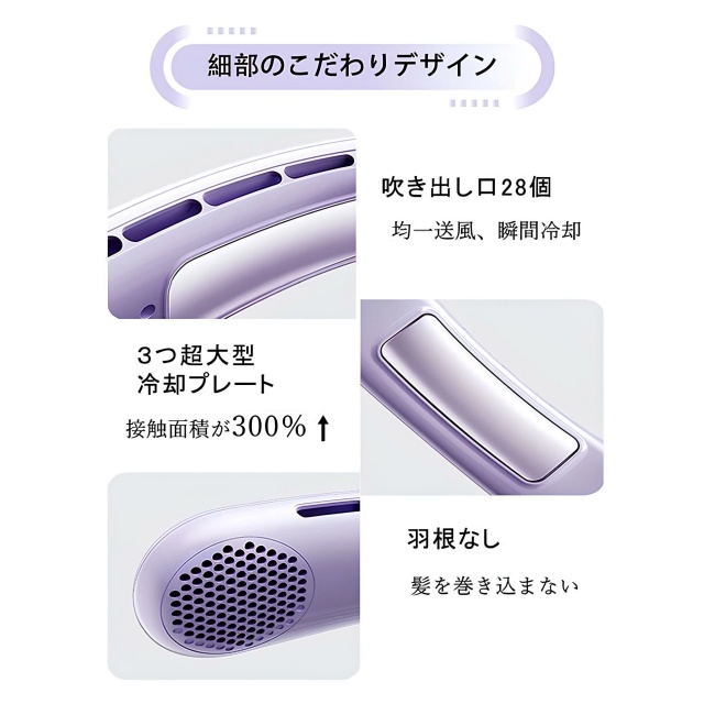 従来品の携帯扇風機と違い羽根なしデザインを採用し、数枚のターボファンブレードがより強力に送風でき、髪が引っ掛かったり物を巻き込むご心配もありません。。 ネックファン両側の一部に着脱しやすくなるためシリコン素材を使用していますので、体型を問わずにフイットします。