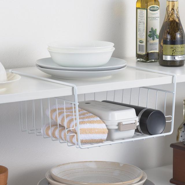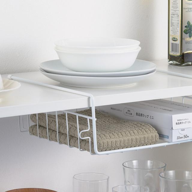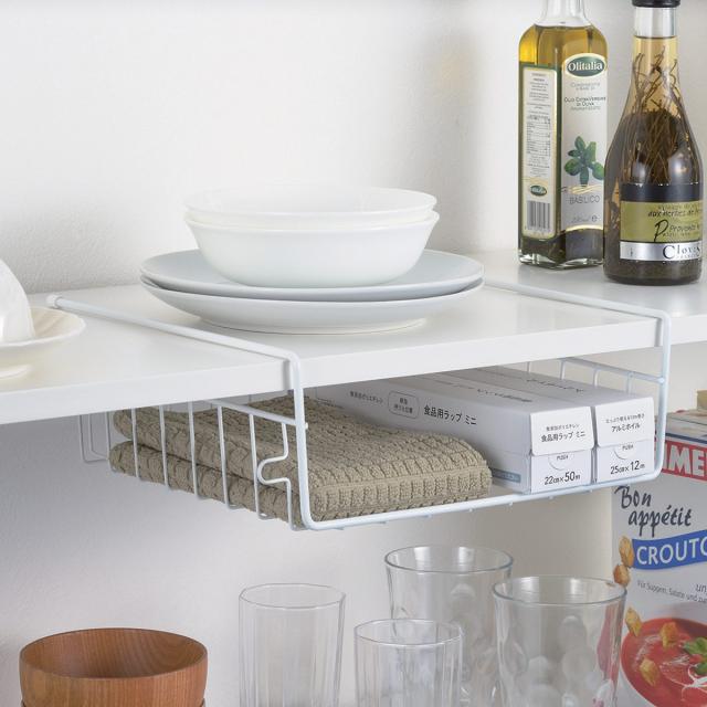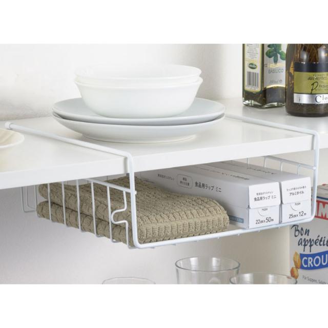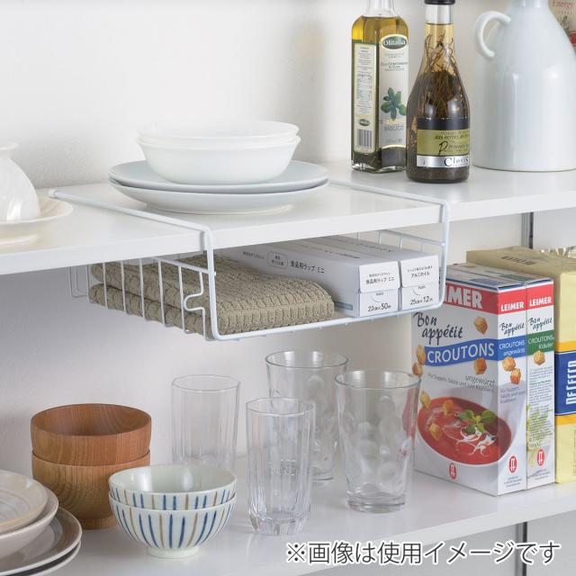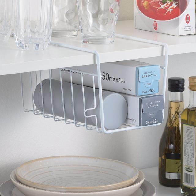 吊り戸棚の棚板に差し込むだけで、簡単に取り付けられるハンガーバスケットです。よく使うキッチンペーパー・ラップ・布巾・調理道具・水筒など、すぐに手の届くところにすっきり収納できます。