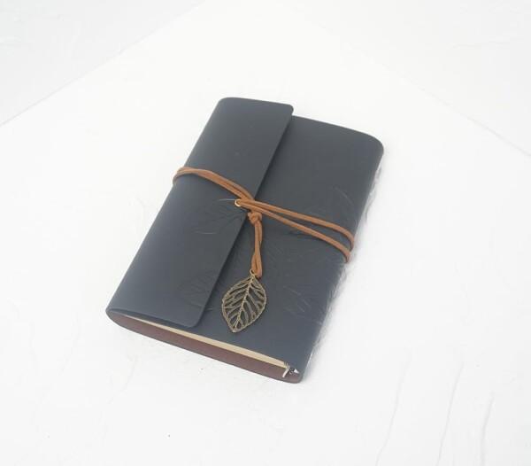 【かわいいデザイン】日記帳はPU紐の端に金属葉付きデザインにして二本のブラウンレザー腰紐で手軽に縛りできます
