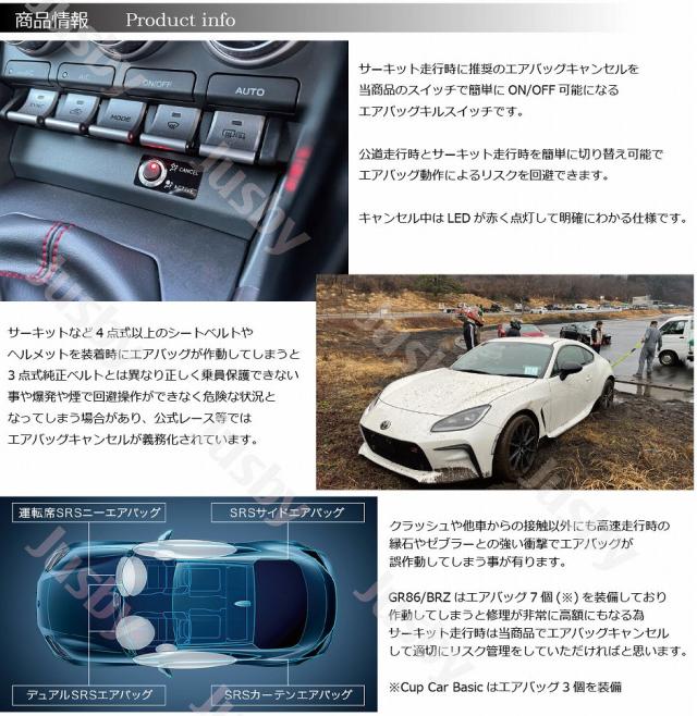 | GR86 BRZ エアバッグキルスイッチ ZN8/ZD8専用です サーキット走行時に推奨のエアバッグキャンセルを当商品のスイッチで簡単にON/OFF可能になります。キャンセル中はLEDが赤く点灯して明確に判断できる仕様です。 サーキットなど4点式以上のシートベルトやヘルメットを装着時にエアバッグが作動してしまうと3点式純正ベルトとは異なり正しく乗員保護できない事や爆発や煙で回避操作ができなく危険な状況となってしまう場合があり、公式レース等ではエアバッグキャンセルが義務化されています。 クラッシュや他車からの接触以外にも高速走行時の縁石やゼブラーとの強い衝撃でエアバッグが誤作動してしまう事が有ります。 GR86 BRZはエアバッグ7個(CUP CAR Bacicは3個)を装備しており作動してしまうと修理が非常に高額にもなる為、サーキット走行時は当商品でエアバッグキャンセルして適切にリスク管理をしていただければと思います。 別途をしておりますので参考にして頂ければ幸いです 商品装着方法をわかりやすい動画での説明をしておりDIYでも十分装着可能です。 ・取付け説明動画は購入者特典となっており公開しておりません。 【注意事項】 ・サーキット等で4点式以上のシートベルト&ヘルメット装着時のみ当スイッチのCANCELをご使用ください ・公道走行時は必ず3点式の純正シートベルトを使用し当スイッチはACTIVEとして走行をしてください ・装着後のスイッチの操作はエンジンOFF時もしくはエンジン稼働時は停車時(車速0km)に行ってください。走行中は操作しないでください(正常に反映しない場合があります) ・スイッチ操作から反映までに1〜7秒ほどかかります。反映確認後に走行してください(紹介動画参照) ・事故等の状況によっては100%のエアバックキャンセルやエアバッグ作動を保証出来ません |