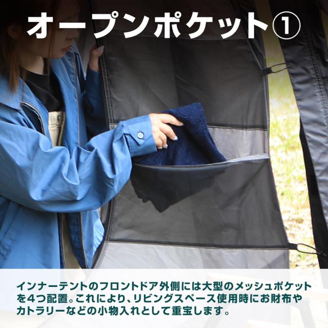 (1)インナーテントのフロントドア外側には大型のメッシュポケットを4つ配置。