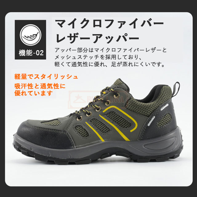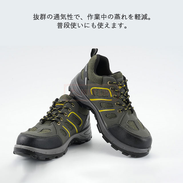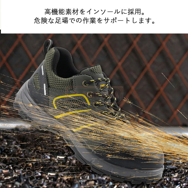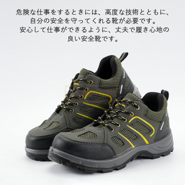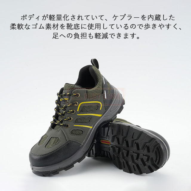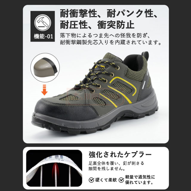 | 特徴 | ◆釘踏み抜き防止 ミッドソールはケブラー防弾繊維を特別に採用するこそ、驚きの1100Nに達するまでの圧迫力に耐えられ、釘などに踏んでも平気。 ◆鋼先芯・つま先保護 金槌の衝撃や刃物の落下など作業中の事故からつま先をしっかり保護しています。車が乗っても大丈夫そうな強度あり、安全性ばっちり! ◆耐滑・耐摩耗性 作業靴として、耐摩耗性に優れたゴム素材と滑りにくさを考慮したアウトソールを採用します。底も滑り止めデザインで効果が向上させます。 ◆通気性抜群 あんぜん靴のアッパーがメッシュなので通気性は良いです。インソールも通気性良い素材を採用しています。作業靴全体は柔らかいので、履きやすくて疲れにくいです。 |