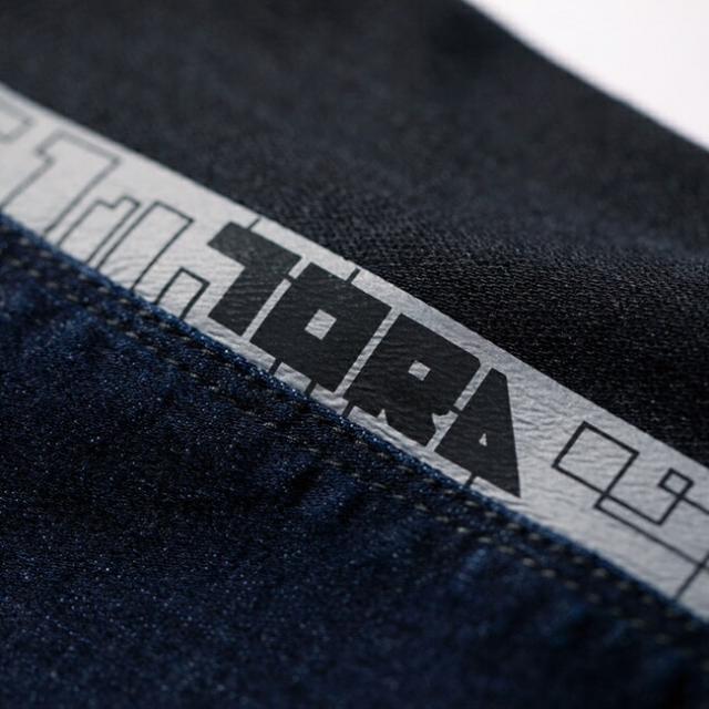 ●【ラバーフレックス(R)】伸長率約70%、回復率約90%の横伸びストレッチを主材に、摩擦する部分にコーデュラ(R)デニムで補強