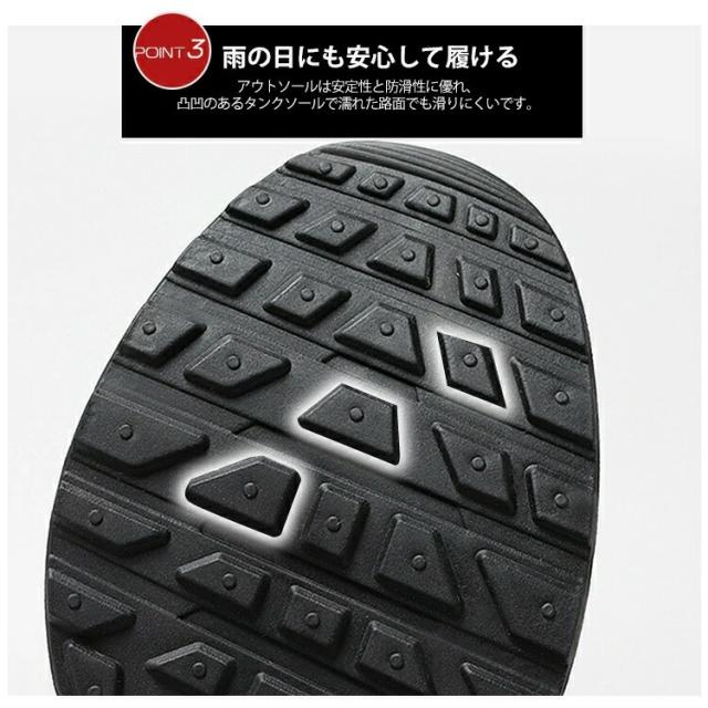 アウトソールは安定性と防滑性に優れ、凸凹のあるタンクソールで濡れた路面でも滑りにくいです。