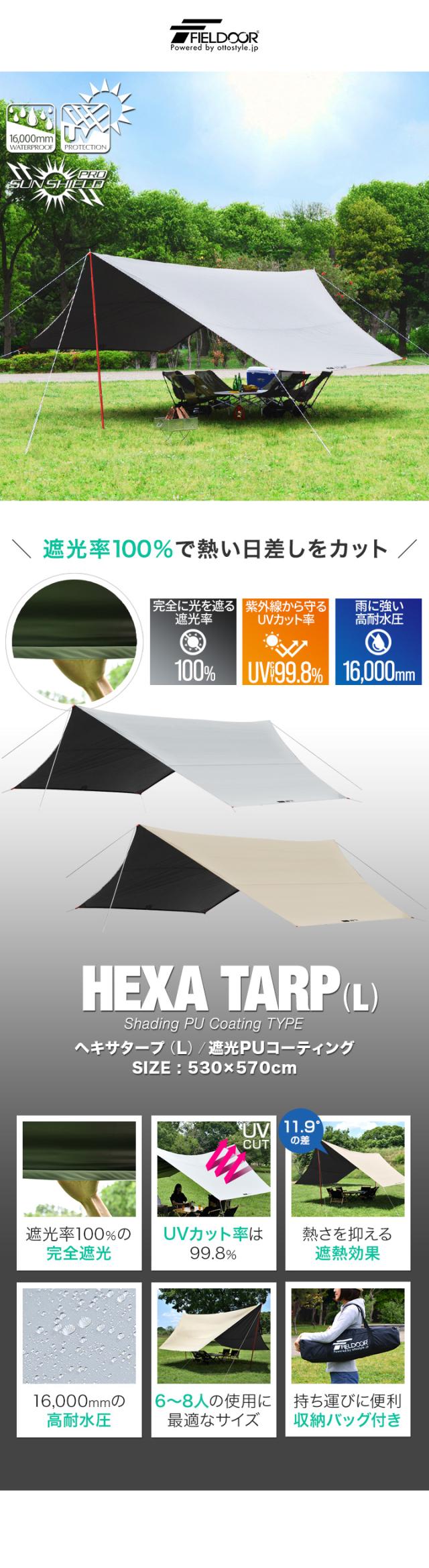 FIELDOOR ヘキサタープ 遮熱 遮光 幅530cm×570cm Lサイズ 6〜8人用 タープテント 日よけ UVカット 高耐水 大型 テントポール 4人 5人 6人 サンシェード オーニング スクリーン 六角形 タープ テント アウトドア BBQ キャンプ 1年保証 送料無料