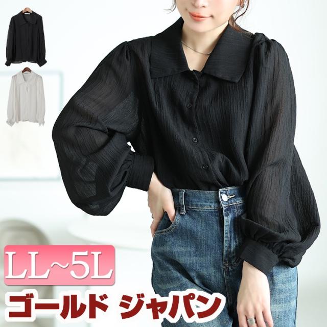 冬新作 大きいサイズ レディース トップス ブラウス シャツ ボリュームスリーブシワ加工シアーシャツ 長袖 ボリュームスリーブ シアー 透け感 シワ加工 襟 ボタン ギャザー ストレッチ ゆったり 無地 春服 夏 秋服 LL 2L 3L 4L 5L ブラック 黒 ホワイト 白 ゴールドジャパン