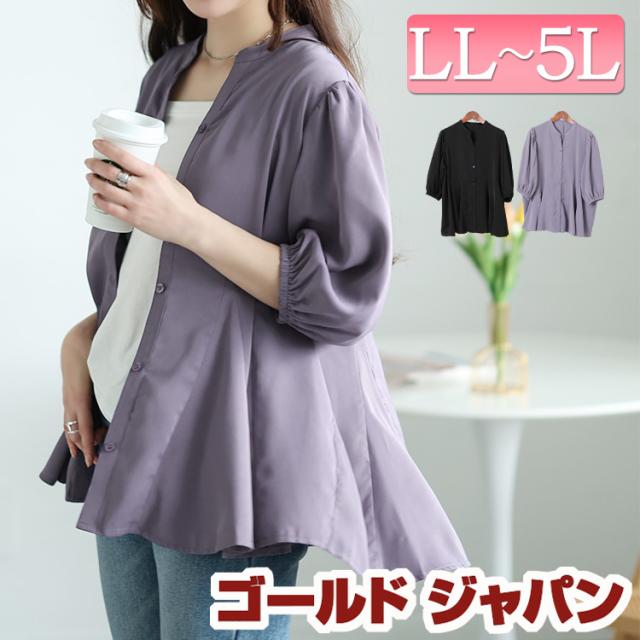 冬新作 大きいサイズ レディース トップス ブラウス シャツ キーネックボリュームフレアブラウス フレアブラウス キーネックシャツ 5分袖 キーネック タック フレア ペプラム パワショル ボタン ゆったり 春服 秋服 LL 2L 3L 4L 5L ブラック 黒 ラベンダー ゴールドジャパン