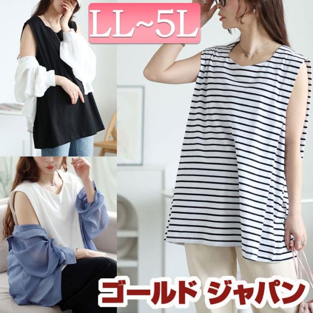 春新作 大きいサイズ レディース チュニック タックショルダーノースリーブチュニック ノースリーブ ボーダー 柄 タック ハートネック タンクトップ タンク ストレッチ ロング ゆったり 春服 夏服 秋服 LL 2L 3L 4L 5L オフホワイト 白 ブラック 黒 オフ ゴールドジャパン