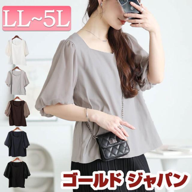 春新作 大きいサイズ レディース トップス カットソー シフォンバルーンスリーブプルオーバー 5分袖 バルーンスリーブ シフォン ギャザー パワショル ハートネック 春服 夏服 秋服 LL 2L 3L 4L 5L オフホワイト 白 グレー ブラウン ネイビー ブラック 黒 ゴールドジャパン