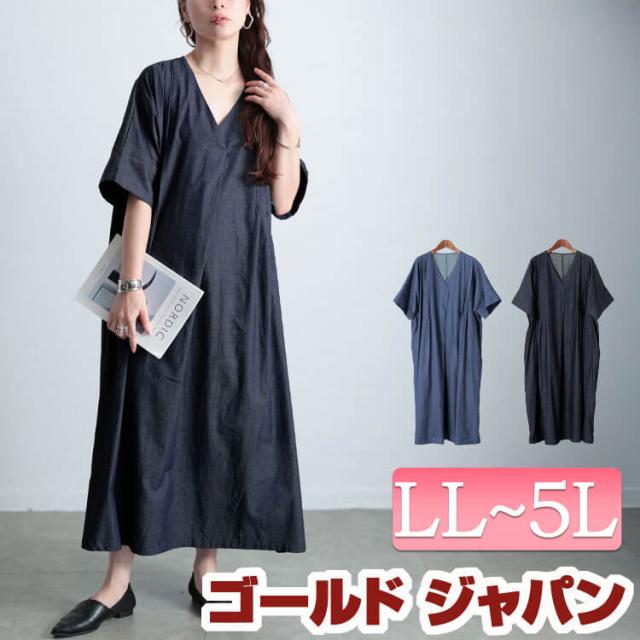 大きいサイズ レディース ワンピース コットンシャンブレータックワンピース ワンピ ロングワンピース ロング 5分袖 半袖 Vネック タック ピンタック シャンブレー フレア ポケット デニム ゆったり 春新作 春服 夏服 秋服 LL 2L 3L 4L 5L ブルー ネイビー ゴールドジャパン