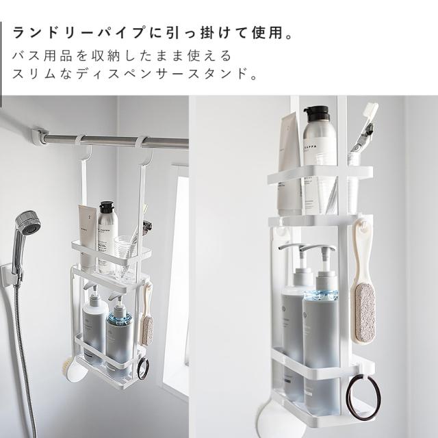 バス用品をまとめて収納できる引っ掛けディスペンサースタンド。ディスペンサーやチューブなどをまとめて収納。
