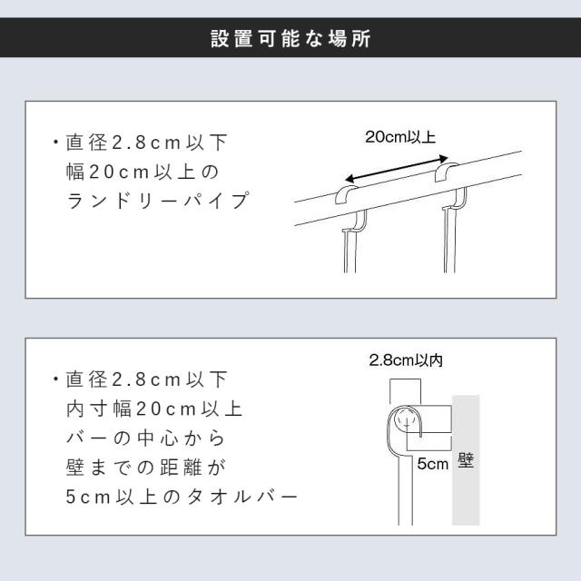 ■設置可能な場所:直径2.8cm以下・幅20cm以上のランドリーパイプ 直径2.8cm以下・内寸幅20cm以上・バーの中心から壁までの距離が5cm以上のタオルバー ※サイズや形状、材質、強度によっては設置できない場合があります。