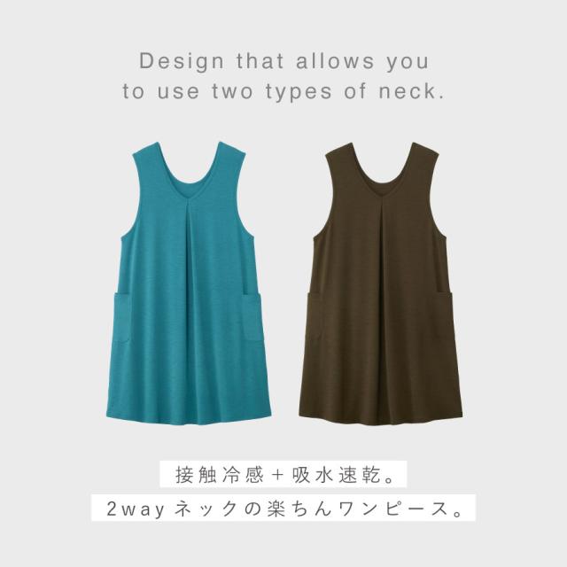 接触冷感+吸水速乾。2wayネックの伸び伸び楽ちんジャンパースカート。お出かけはもちろん、お家でのリラックス時間にも、ヘビロテできるアイテム。襟元がすっきり見えるV首、ソフトな印象の丸首。