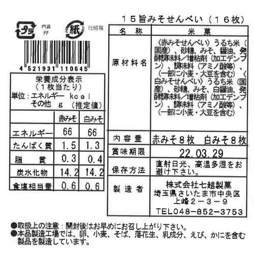 ●赤みそせんべい:うるち米(国産)、砂糖、みそ、醤油、発酵調味料/増粘剤(加工デンプン)、調味料(アミノ酸等)、(一部に小麦・大豆を含む)
