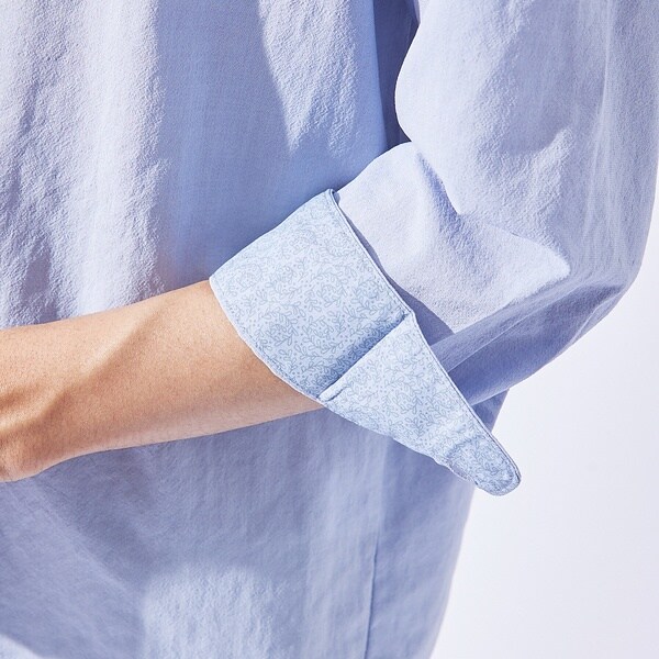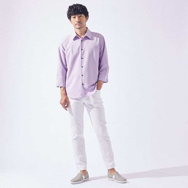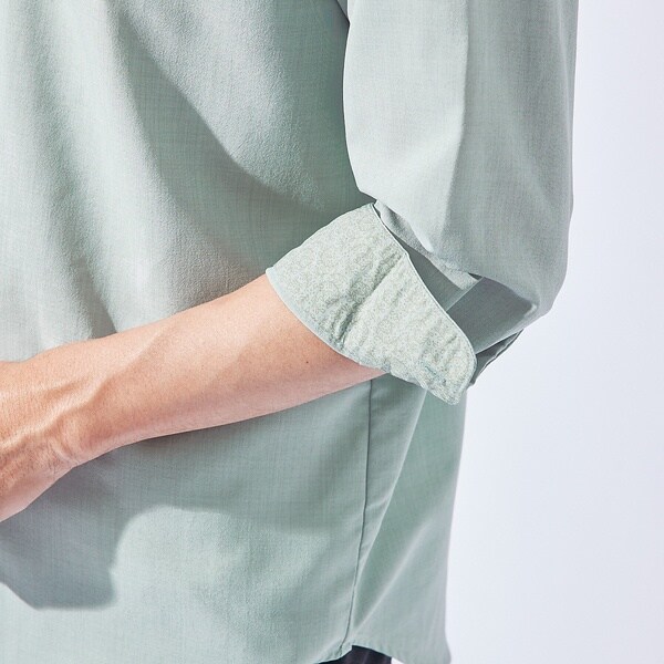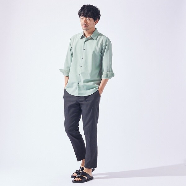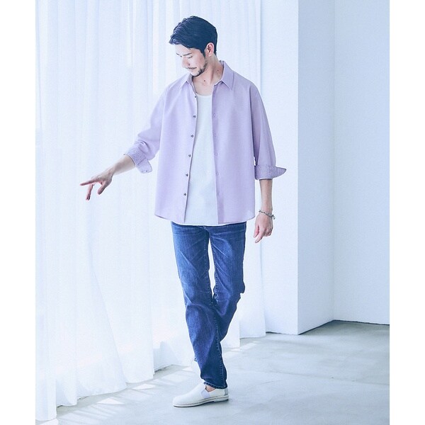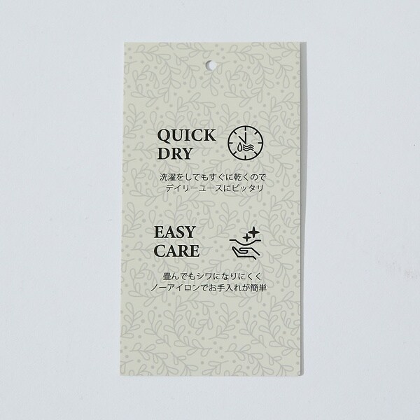 畳んでもシワになりにくいイージーケア性に優れた素材。洗濯してもすぐ乾くのでデイリーユースにぴったりです。天然素材のような質感でさらりとした清涼感のある肌触りなので、これからの季節ストレスなく着用頂けます。