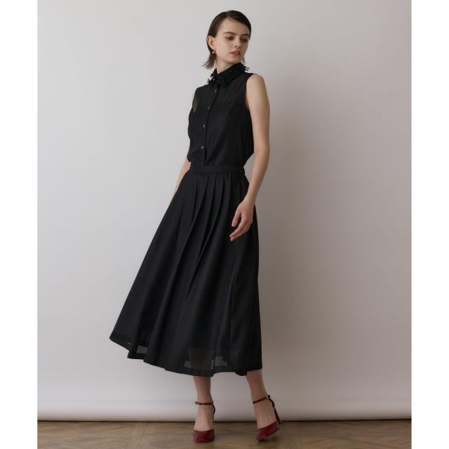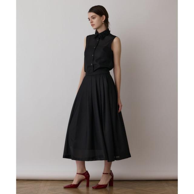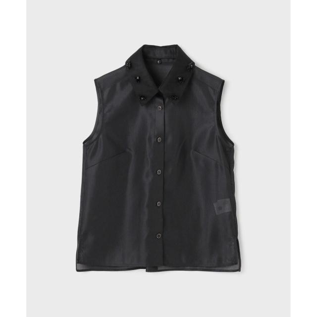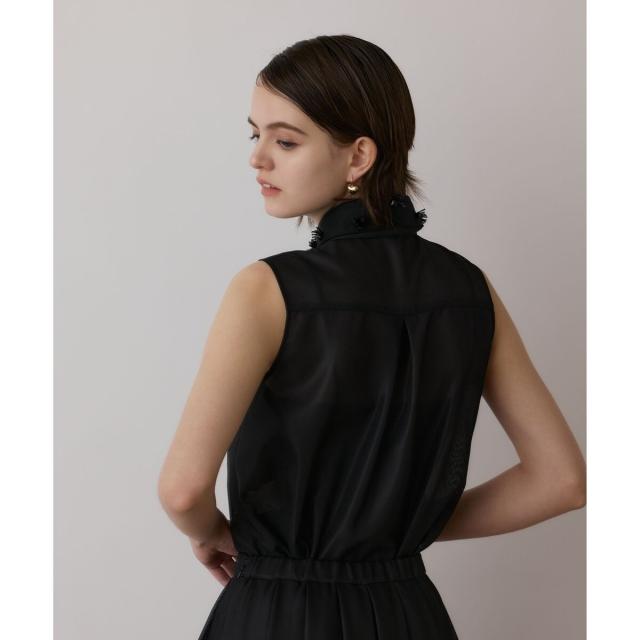 【JapanFabric】 密度が高く透け過ぎない、大人の上品なサマースタイルにぴったりなノースリーブシャツ。 糸を絡ませて織る事で隙間ができるメッシュカラミ素材を使用。かしこまりすぎないメッシュの雰囲気が日常からセミフォーマルまで様々な場面まで取り入れやすく、綺麗めなお出かけやお食事会等にもぴったりです。顔回りを華やかに演出してくれるビジュー衿は取り外しもでき、シーンやお好みによってアレンジも可能。モノトーンならではのシックな雰囲気と華やかさが共存した、GRACCE CONTINENTALならではの一品です。メイドインジャパンならではの美しい素材や丁寧な縫製に心惹かれる一品。お揃いのスカートを合わせる事で、ワンピース風の着こなしもぜひお楽しみください。