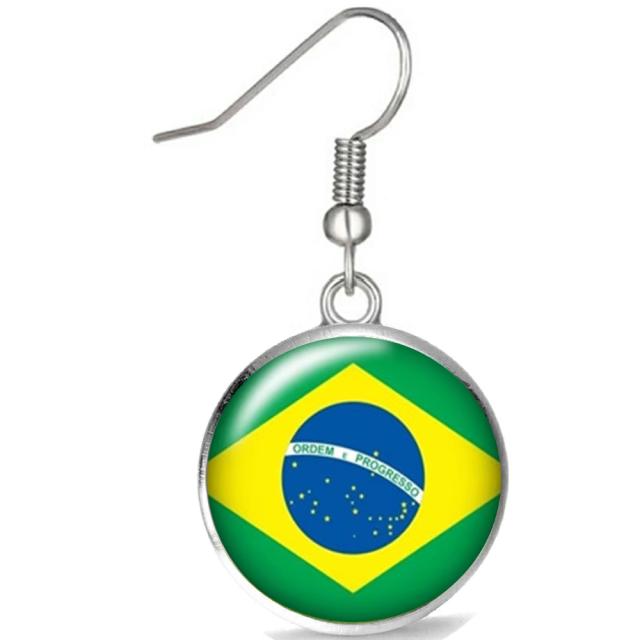 銀色シルバーの丸型のカボション用の台座にブラジルの国旗をデザインしたオシャレなステンレスピアス。