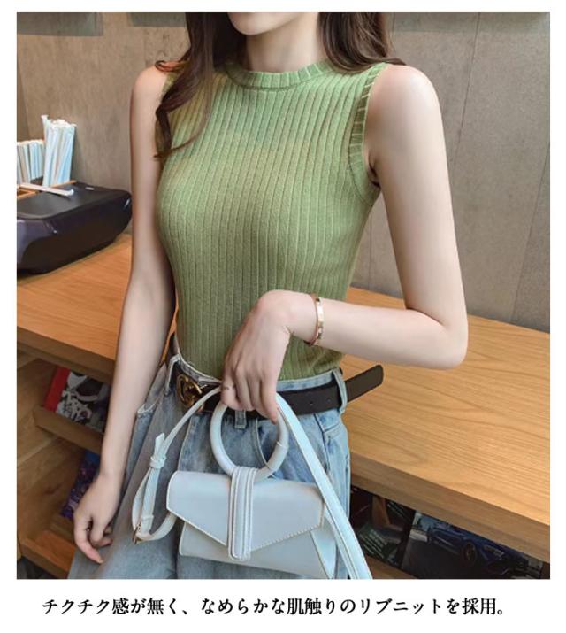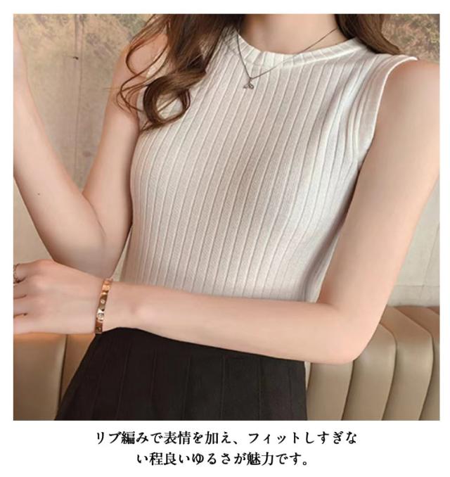 涼感 レディース プリーツニットトップス サマーニット プチハイネック ノースリーブ プチハイネック プリーツ タンクトップ リブニット ストレッチ インナー ノースリーブ トップス ハイネックニット トップス さらさら オフィス