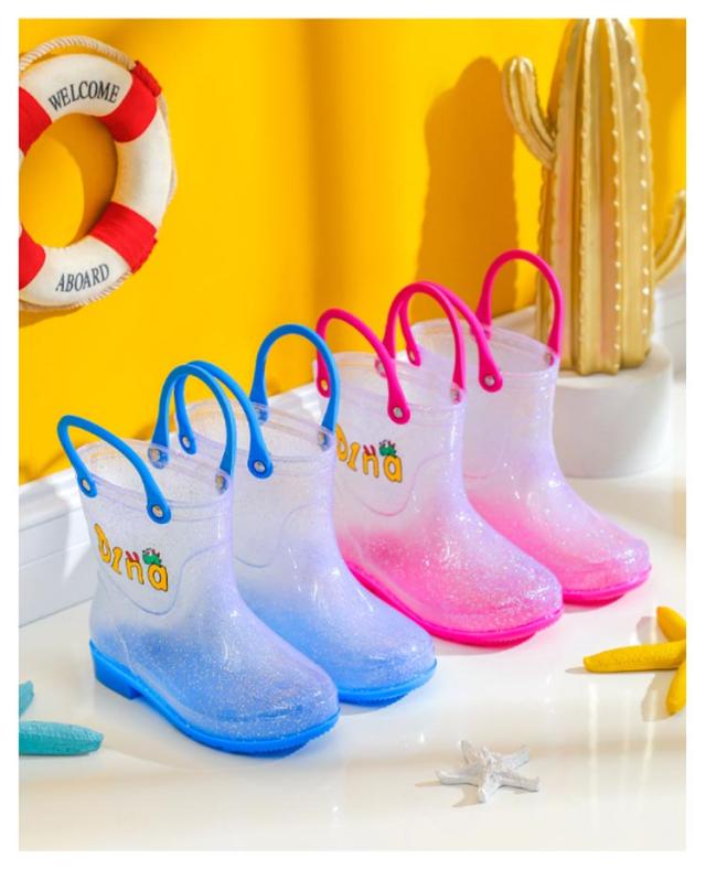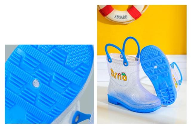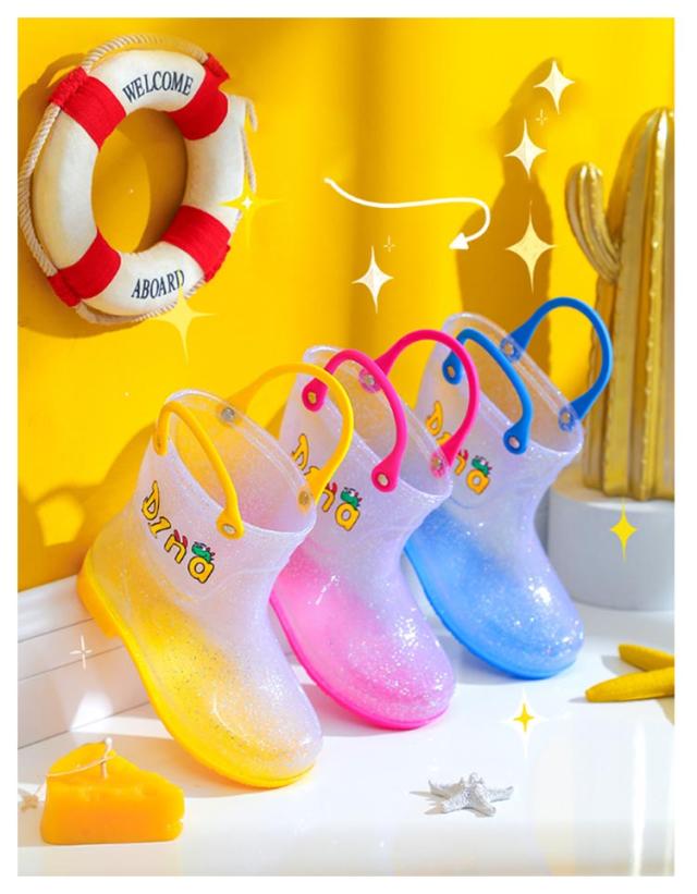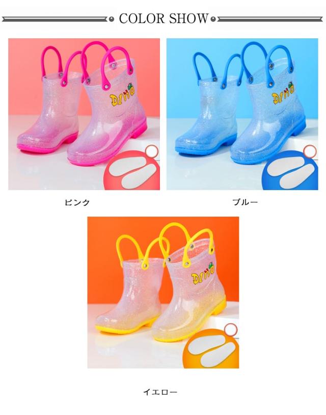 | シンプルなデザインのキッズレインシューズ。コットンインソールが付属しており、レインブーツをより快適に履くことができます。 どろんこ遊びや砂場・水遊びでも足元がぬれなくて、大活躍!寒い季節なら、ちょっとした防寒用にも! 雨の日も笑顔で通園、通学できるオススメアイテム! スッキリとしたシルエットにキラキラクリアデザインがキュート。 シンプルなクリアデザインにキラキララメが足もとを可愛く演出します。 履き口が大きく、柔らかい素材なので脱ぎ履きが楽ちん。 | |