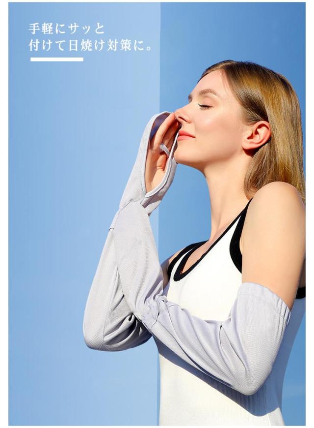 | UPF50+、紫外線遮蔽率95%以上! 日常の様々なシーンに欠かせないアームカバー。 手軽にサッと付けて日焼け対策に。 指かけタイプで指先から二の腕までカバー。 スマホの操作や車、自転車のハンドルもすべらない。 | |