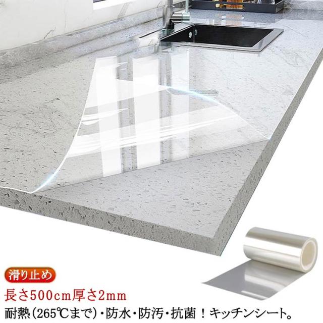 265℃までOK!耐熱 キッチンシート 防水 透明 保護シート 長さ500cm厚さ2mil クリア 台所 調理台 保護マット 防汚 防カビ 抗菌 シート キッチン用シート シンクマット 戸棚シート 汚れ防止 キズ防止 滑り止め 洗面台 壁紙 カットOK 接着剤不要 貼って剥がせる 賃貸 送料無料