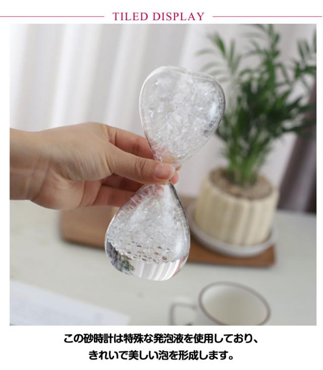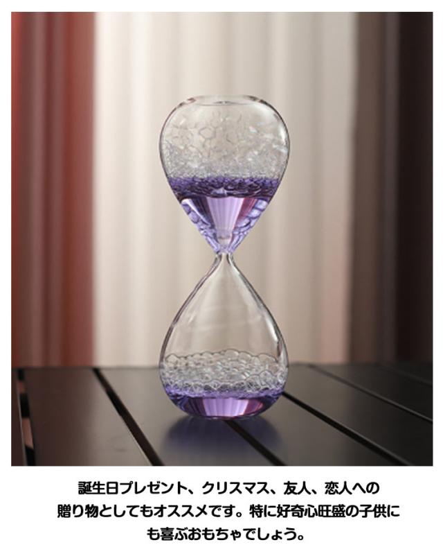 | この砂時計は特殊な発泡液を使用しており、きれいで美しい泡を形成します。 泡がゆっくりと落ちるストレス軽減効果のあるバブルタイマーです。 癒しグッズ或いはストレス解消用のおもちゃ/癒されるオイルタイマー / オイルモーション として使えます。エネルギーを使い果たしても、回転するだけでやり直します。 書斎の本棚や窓際のスペース、キッチンのカウンターなど、オブジェとして飾るだけでも素敵な存在感です。 誕生日プレゼント、クリスマス、友人、恋人への贈り物としてもオススメです。特に好奇心旺盛の子供にも喜ぶおもちゃでしょう。 | |