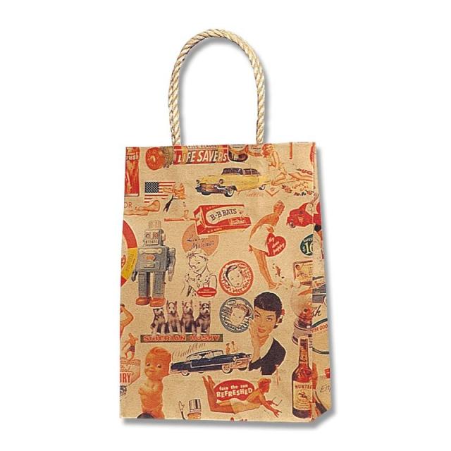 樹脂製の接着剤で手紐を取り付けた手提げ紙袋です。紐の結び目がなくすっきりし、物の出し入れがスムースで、ストックする際にかさばらないメリットがあります。コンパクトな人気サイズで、小物雑貨やちょっとしたギフトに。オールドアメリカン調のイラストが満載のデザイン。