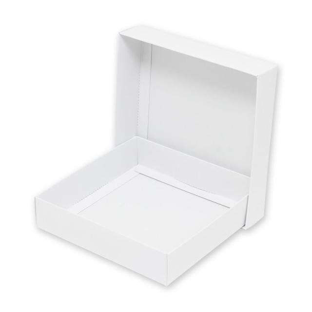 汎用性の高い白無地の組立箱です。フタと本体を別々に組み立てるかぶせブタ式で、四方を立ち上げて折り込んで仕上げるタイプです。縦・横のサイズが同じ正方形の規格です。10枚入り。
