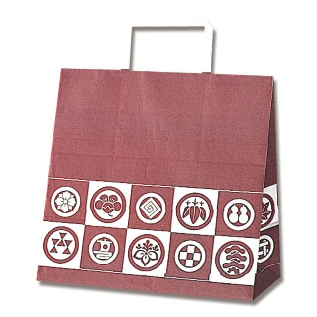 日本の家紋をモチーフにした和風の手提げ袋です。和菓子や和雑貨等にお勧めです。未使用時には紐が飛び出ていないため、在庫スペースにやさしい平紐タイプです。コンパクトながらマチはゆったり。箱ものの収納に適しています。