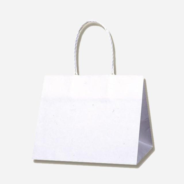 樹脂製の接着剤で手紐を取り付けた手提げ紙袋です。紐の結び目がなくすっきりし、物の出し入れがスムースで、ストックする際にかさばらないメリットがあります。マチを広めに設計していますので、箱もののお持ち帰りに適しています。汎用性の高い白無地。