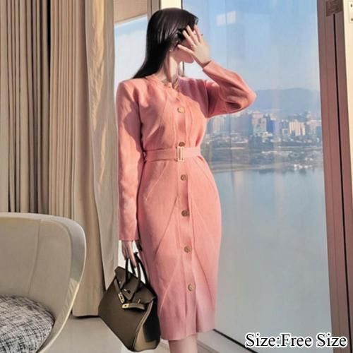 キャバ ドレス キャバドレス ワンピース ミディアムドレス ふんわり ロング 柔らか ニット カーディガン フロントボタン ブラック ピンク フリーサイズ