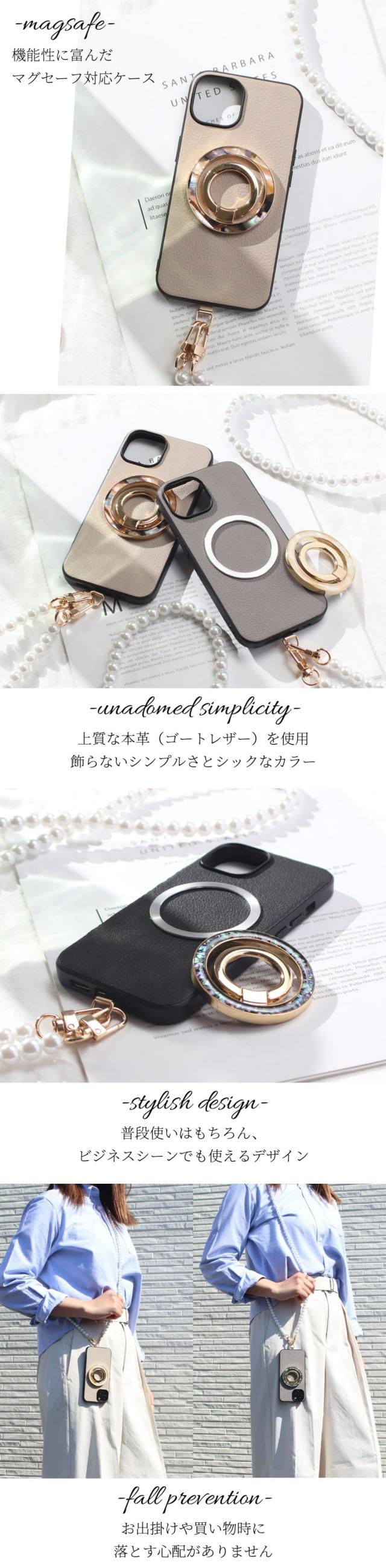 iphoneケース レザー iphone17 iphone16 iphone15 iphone14 リング付き パール ストラップ 本革 17 16 15 14 13 mini マグセーフ対応 magsafe対応 ゴートレザー 16e 16pro 15pro リング ストラップ付き 肩掛け スタンド 17プロ べっ甲 シェル メタリック 金 銀 送料無料