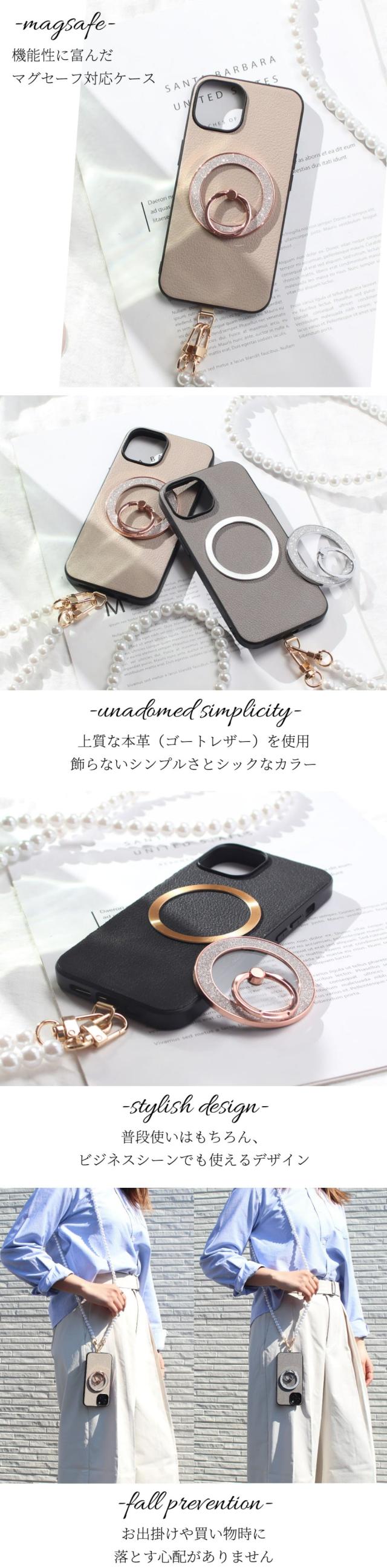 iphoneケース レザー iphone17 iphone16 iphone15 iphone14 リング付き パール ストラップ 本革 17 16 15 14 13 mini マグセーフ対応 magsafe対応 ゴートレザー air 16e 16pro 15pro リング ストラップ付き 肩掛け スタンド マグネット 16プロ メタリック 金 銀 送料無料