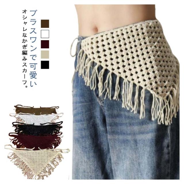 | プラスワンで可愛い♪ オシャレなかぎ編みスカーフ。 首やウェストに巻いたり、ヘッドアクセとしてなどアレンジが無限大! タイトパンツやデニムパンツなどとレイヤードして体型カバーとお洒落を両立させます。 柔らかくファッション感のよいアイテム。気楽にきれいめスタイルを作り出します。 普段のコーデにプラスするだけでスタイリング全体を華やかにしてくれるアイテムです。 | |