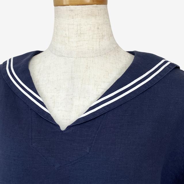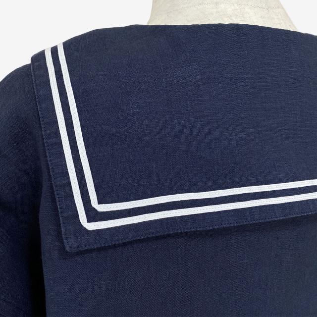 適度にゆとりのあるシルエットで、小ぶりのセーラーカラーにバイカラーのテープが特徴です。