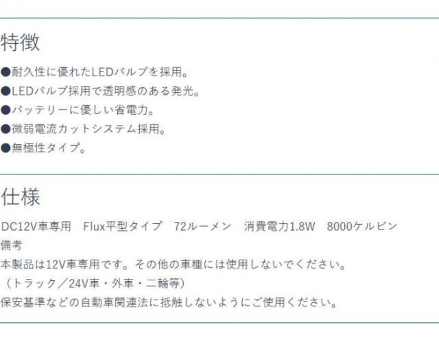 商品詳細:耐久性に優れたLEDバルブを採用しています。LEDバルブ採用で透明感のある発光が特徴です。バッテリーに優しい省電力です。微弱電流カットシステムを採用しています。無極性タイプです。 生産国:台湾 素材・材質:PC樹脂 仕様:形状:3種類ハーネス付T10/T10×31/G14